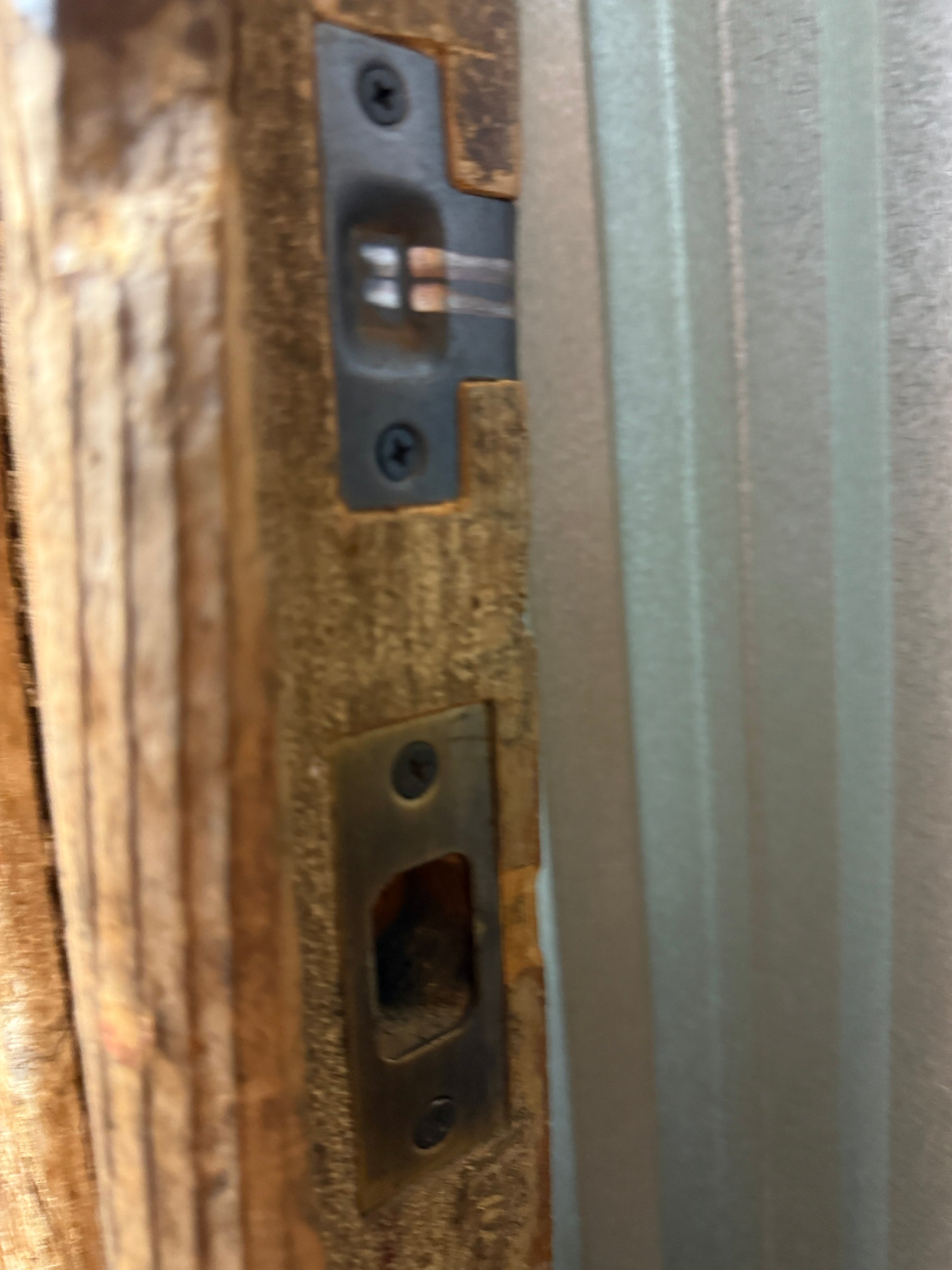 The front shows the exterior of the door with iron scroll work, large brass knobs and the modern addition of a working lock with key. You may want to use these doors as internal and remove the modern lock and glass backing on the iron.