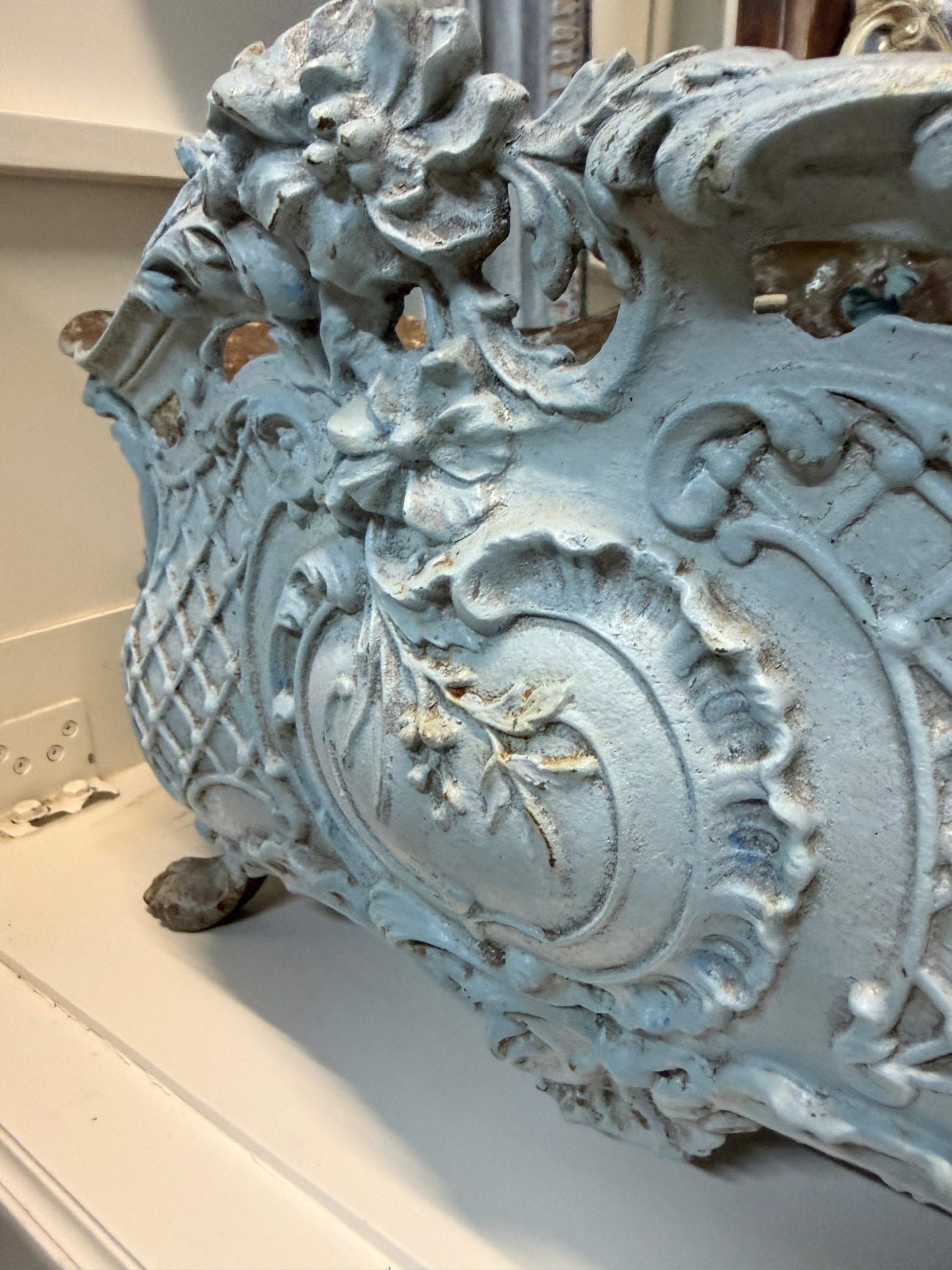 A beautifully timeworn French cast iron jardinière, richly detailed with flowing Rococo revival ornamentation and raised on elegant scrolled feet.