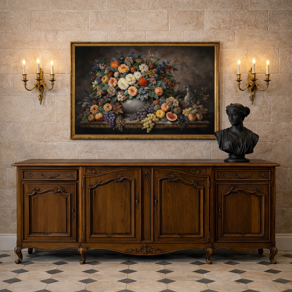 Robust in its form, but adorned with wreath garland and beading details, softens these strong pieces and balances the angular forms.