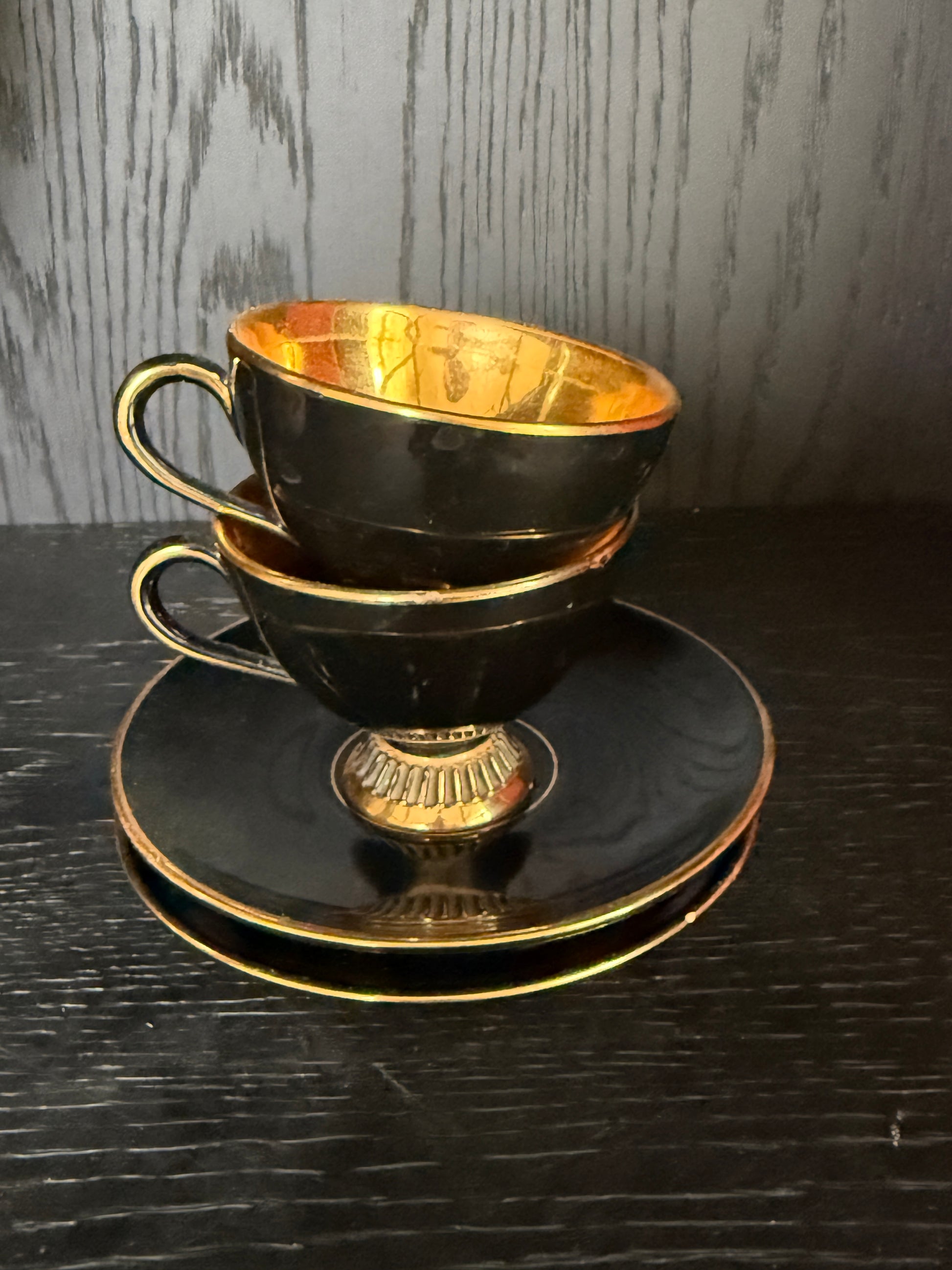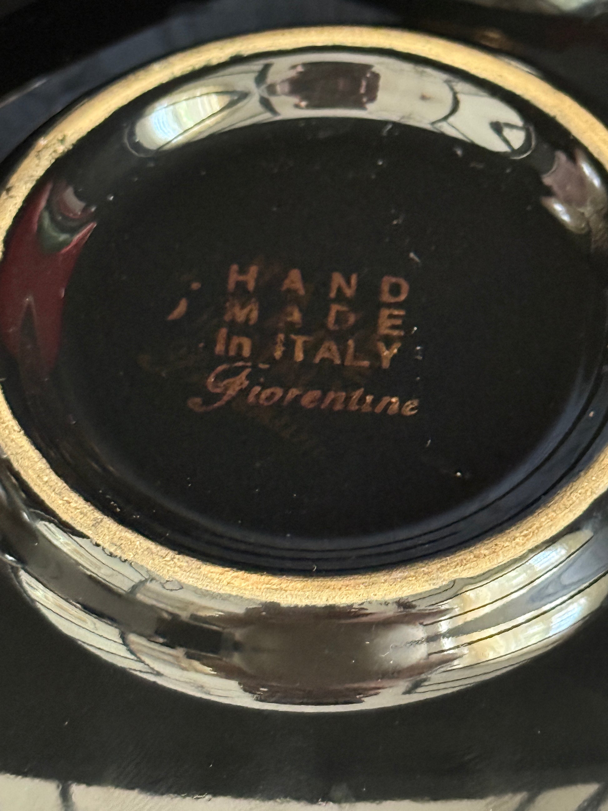 Beautifully delicate, and sleek in black with gold gilding, this Demitasse 2 cup and saucer set is a mid century collectable crafted by Florentine artisans.