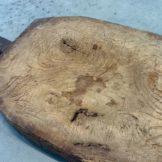If this rustic, pitted, dented and dinged board could share a recipe or two we would be lucky!!! This has had serious wear with a beautiful sunken center perfect for chopping with your Mezaluna knife, polished off by back and sides in a rich patina.