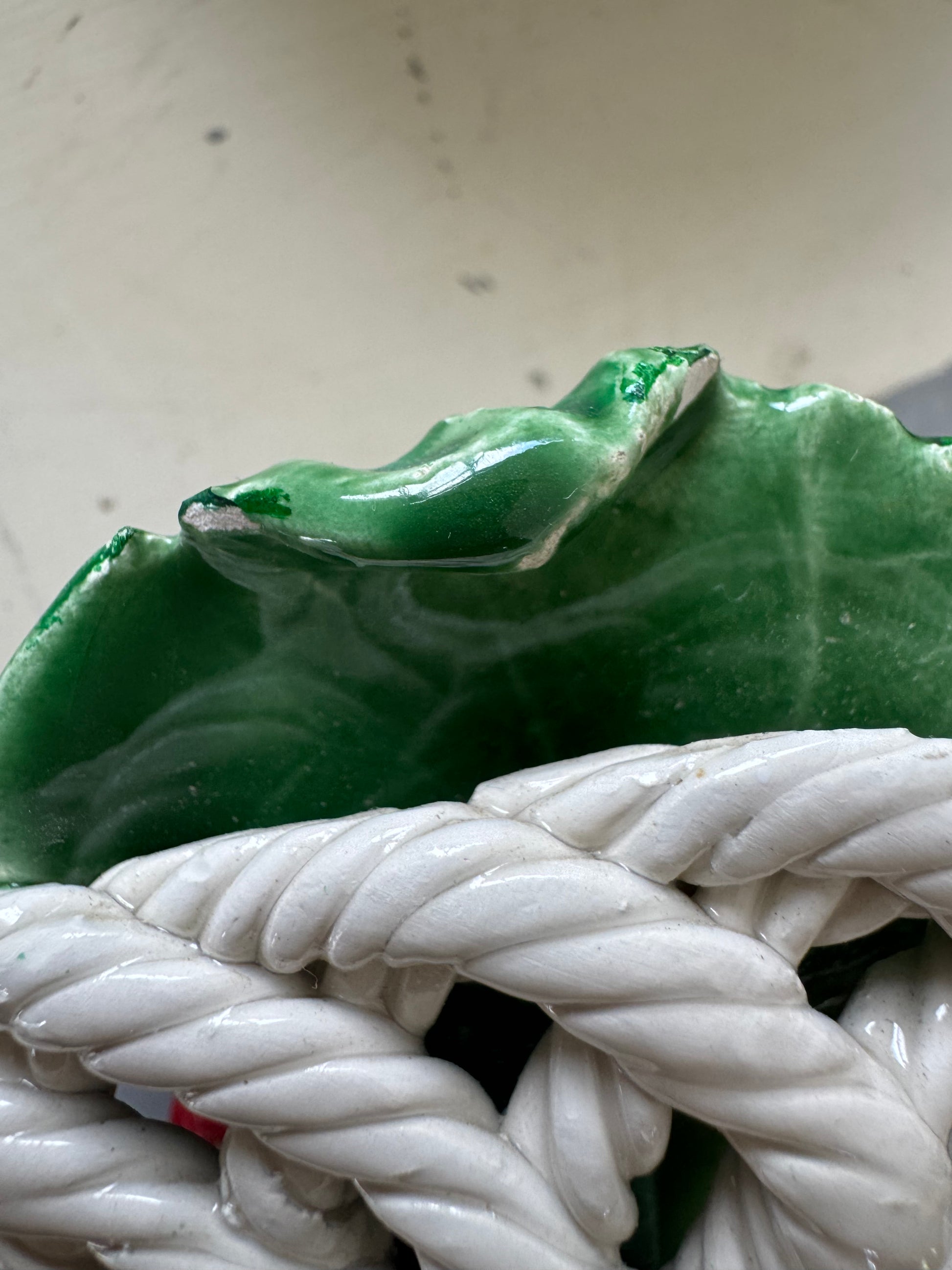 The overglazing in this majolica ceramic is vibrant and gorgeous, nestled into a lattice basket. This shows expert Italian artisanal craft at its best to create a collectable piece of decor whether your style, is country, whimsical, eclectic or traditional.