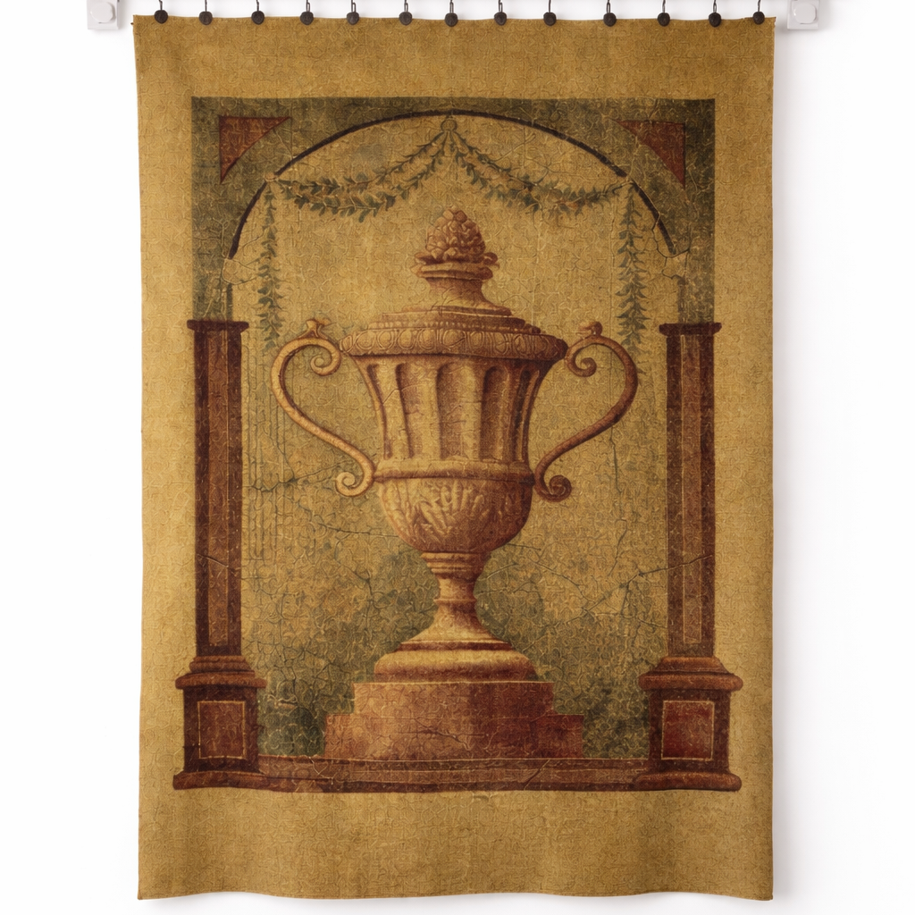 A large-scale jacquard-woven panel depicting a classical urn within an architectural frame, sourced in Provence.